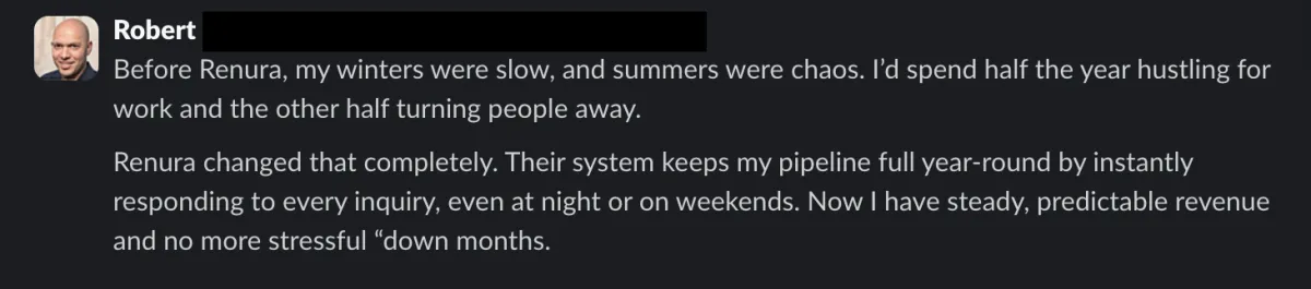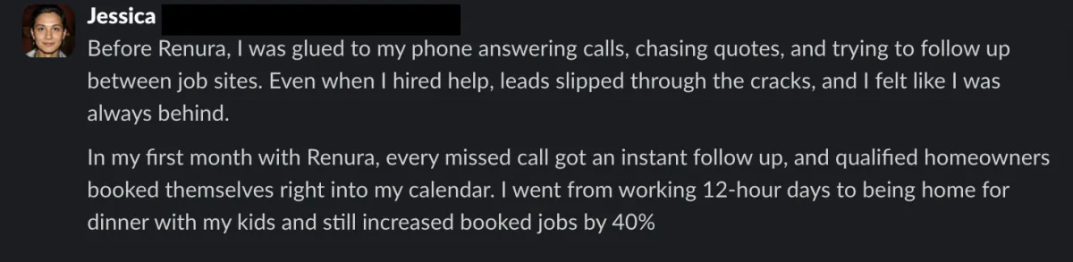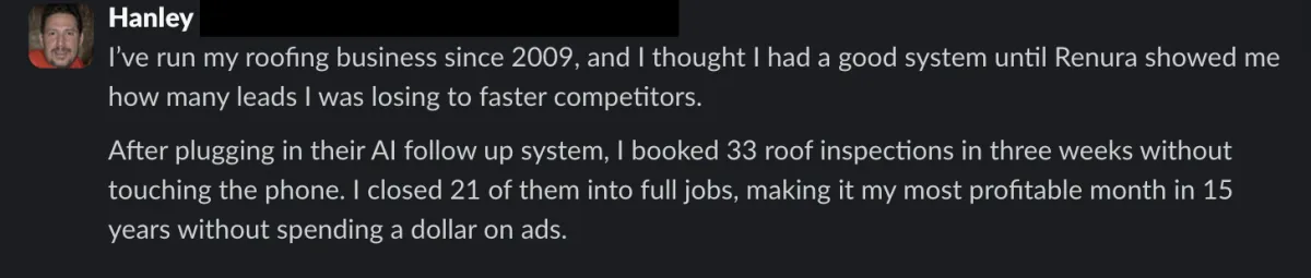 Agencies and VAs rely on people. Renura runs 24/7, never misses a follow‑up, and scales instantly. No hiring, no hand‑holding—just booked roofing jobs on autopilot.